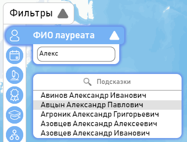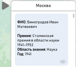 На ней располагаются метки, каждая из которых является городом, содержащим некоторое количество записей о полученных премиях.