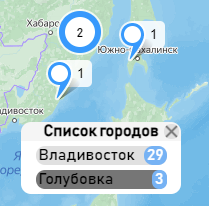 Также города могут собираться в кластеры, чтобы вам было удобнее просматривать карту. Каждый кластер можно открыть с помощью клика. Вам откроется список городов, которые вы можете выбрать.